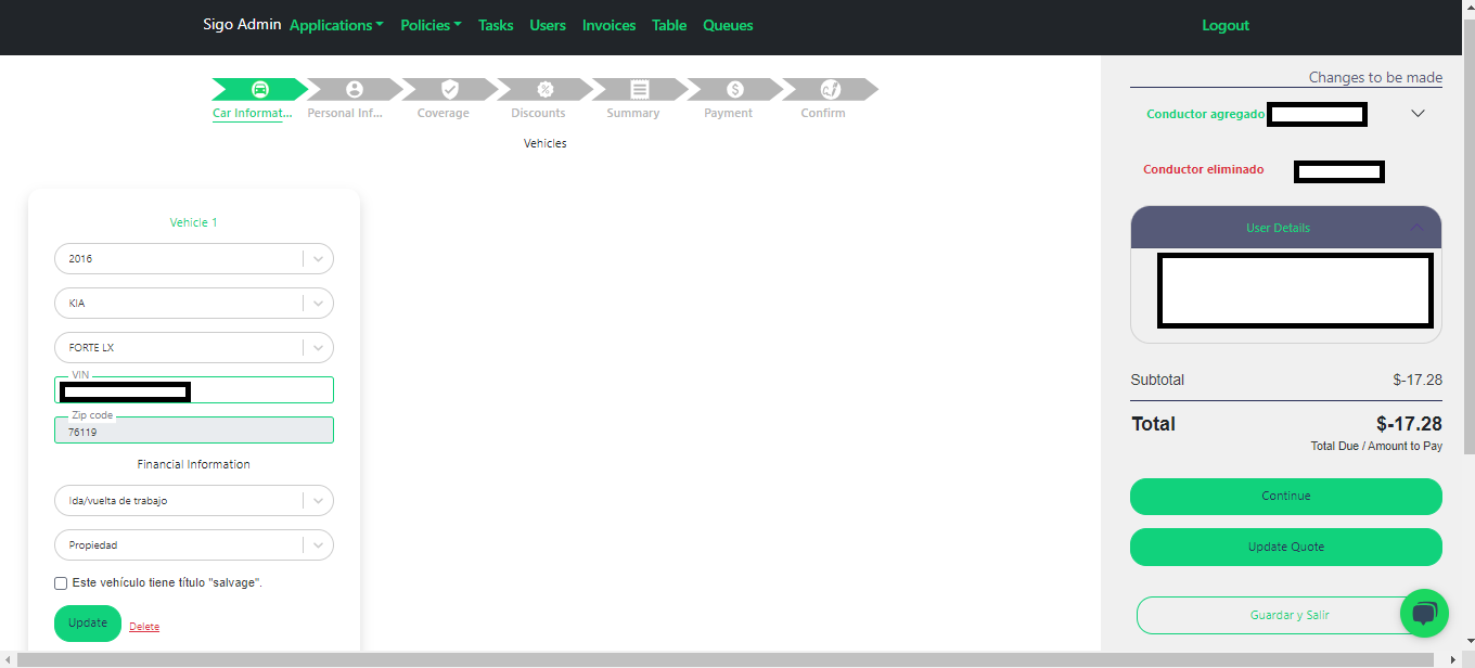 - Primera Tab - Car Information: Aquí se puede modificar información de vehículos 🚗 en endoso.