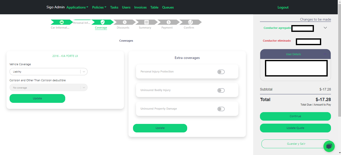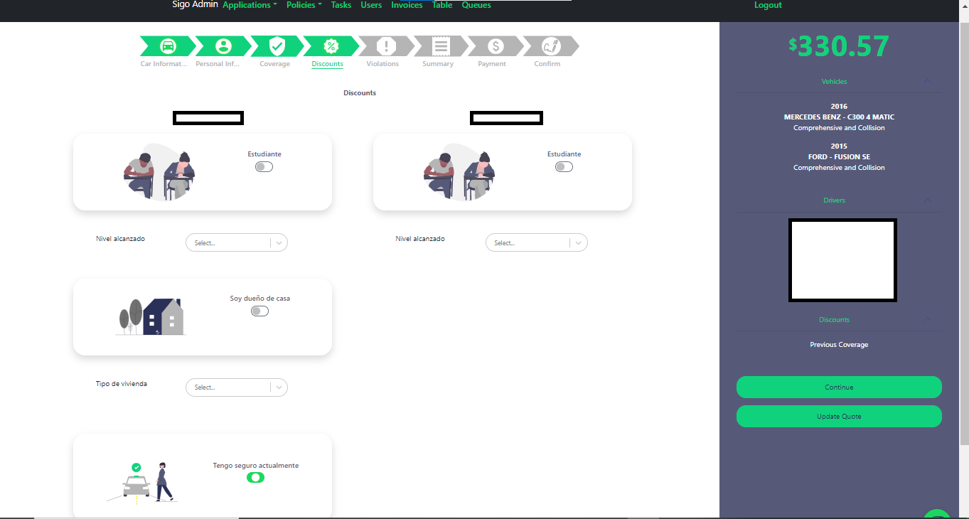- Cuarta Tab - Discounts: Aquí se pueden modificar los descuentos 💰 habilitados para ser incluidos en póliza.