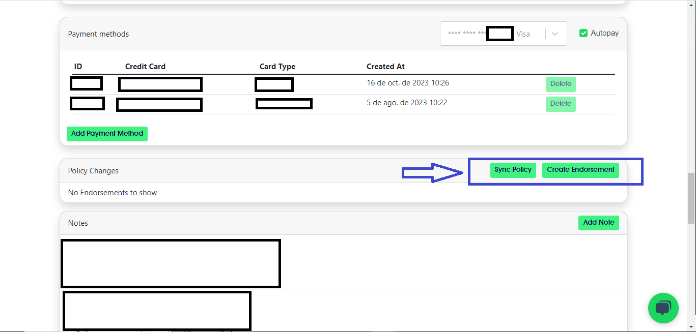 - Sexta Tab - Payment: En esta Tab se ingresa el método de pago 💳 para realizar el endoso. Se pueden generar los links de pagos 🔗 en esta parte en caso de que el cliente desee realizar el pago por su cuenta.