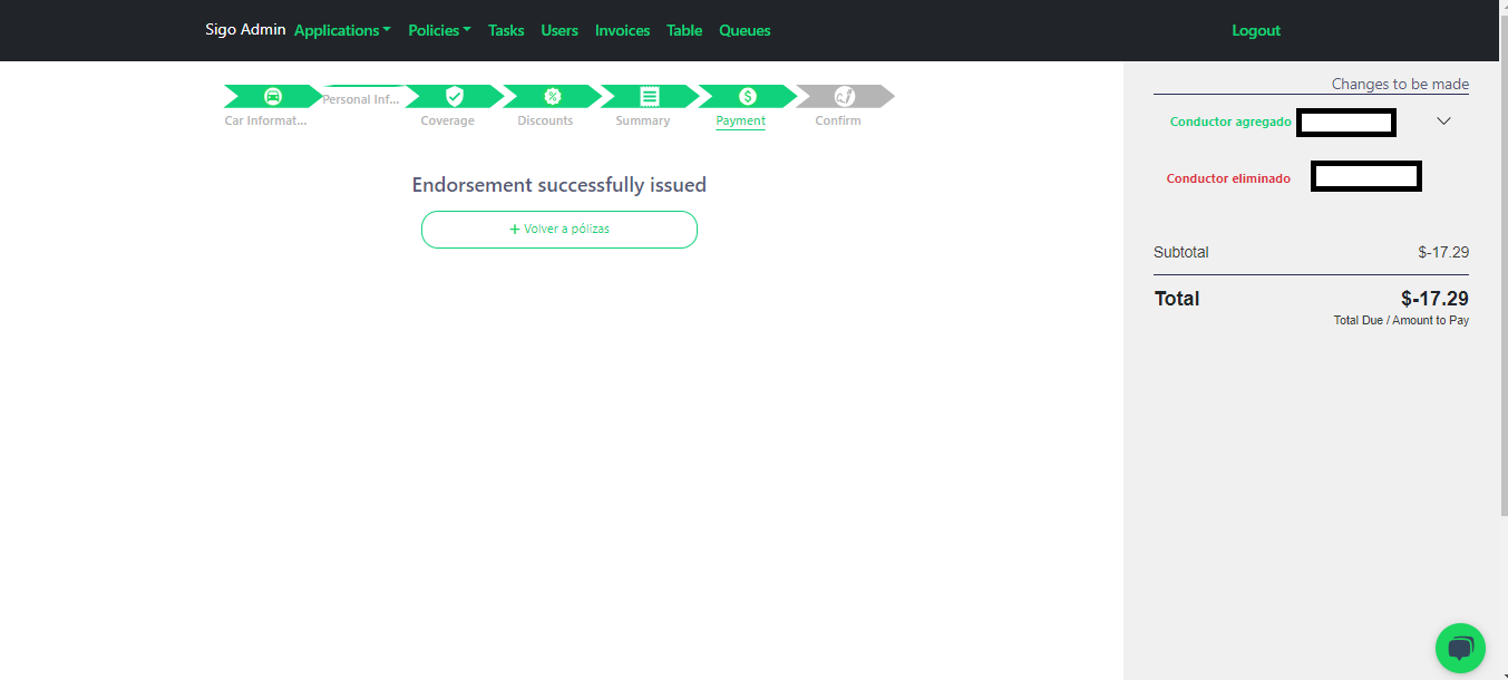 - En resolución del último paso solo es verificar que el endoso se aplicará correctamente. Comentarle al cliente que la documentación se enviará 📧 con los nuevos elementos asegurados.