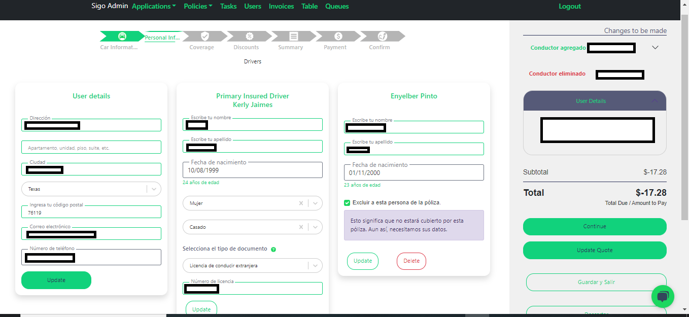 - Segunda Tab - Personal Information: Aquí se puede modificar información de datos personales 🆔. También añadir o remover conductores 🧑.