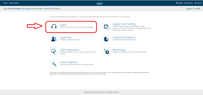 Ya en esta pagina se selecciona la opción de agent. Para así ser redirigido al espacio correspondiente para poder tomar llamadas.