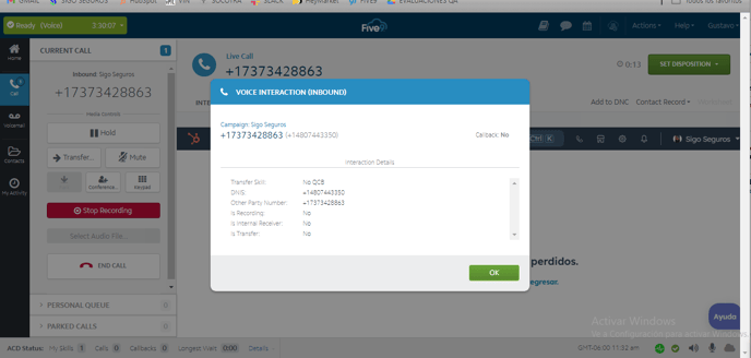Five9 es nuestra herramienta de enlace de llamadas del departamento de Servicio al Cliente por parte de Sigo Seguros: