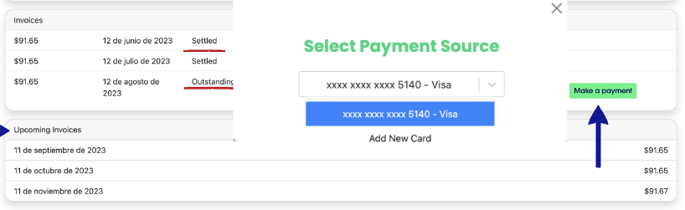 Seleccionamos la opción "make a payment" 💳 y luego elegimos el método de pago de preferencia del cliente. ✅
