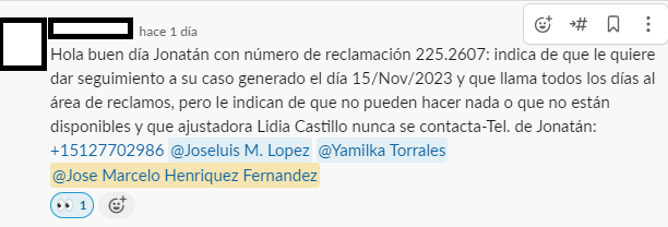 De cliente mencionar que no logra comunicación con el departamento de reclamaciones, procedemos a compartir información en nuestro canal de "customer". 📞ℹ️