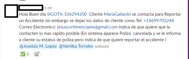 Es necesario solicitar a cliente: Nombre completo 🪪, número de teléfono 📱, número de póliza 📜 y detalles adicionales que sean relevantes 📝. Esto se compartirá en el canal de customer de Slack realizando @ Yamilka Torrales y @Jose Marcelo Henriquez. 👩💻👨💻