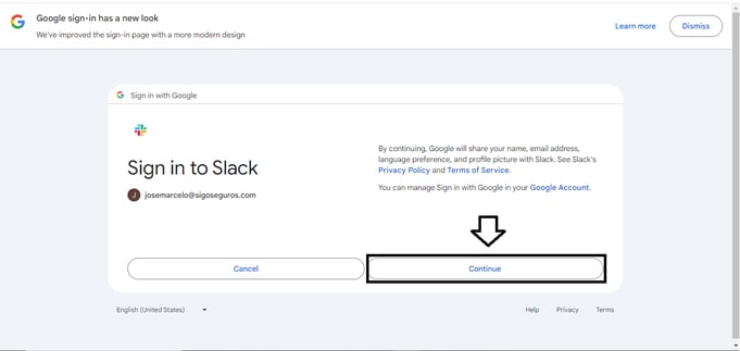 4. Una vez seleccionado el correo electrónico de Sigo Seguros es necesario seleccionar "Continue" para poder aceptar los términos y condiciones.