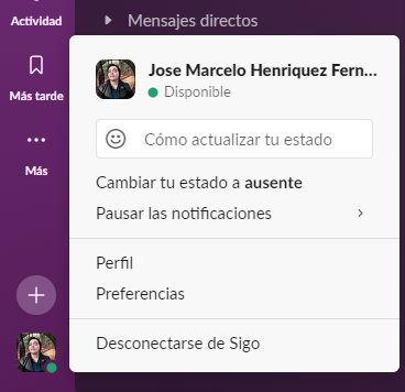 También encontramos las preferencias y cerrar sesión de Slack. Continuación Se describirán las opciones que se ven reflejadas en esta sección: