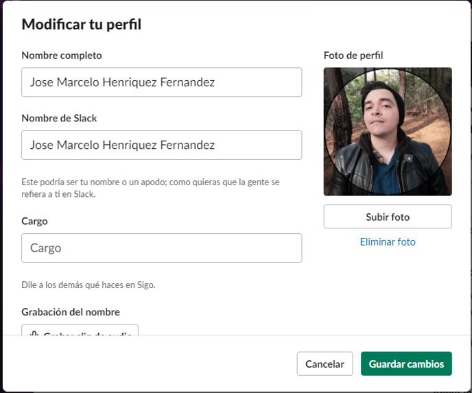 Se pude modificar foto de perfil. Nombre en la plataforma. Cargo en la compañía. Se puede llevar a cabo grabación de tu nombre y la pronunciación del mismo. Como punto final se encuentra la zona Horaria.