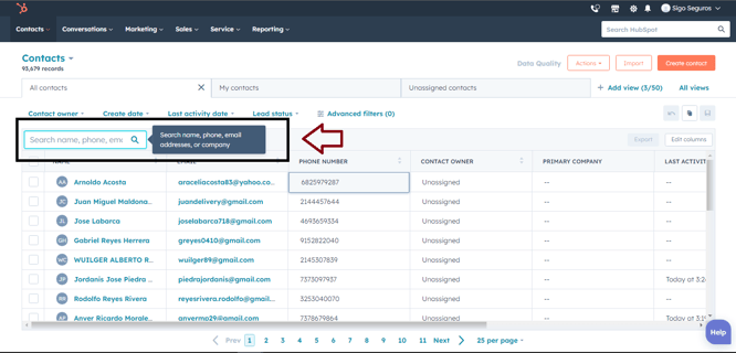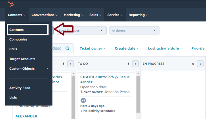 1- Seleccionar dentro de Hubspot el tab de contactos: