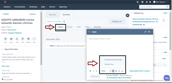 5- Una vez el ticket esta creado se pueden añadir en notas screenshots del error como adjuntar algún tipo de documento que ayude al área de ingenieros a determinar el área de oportunidad.
