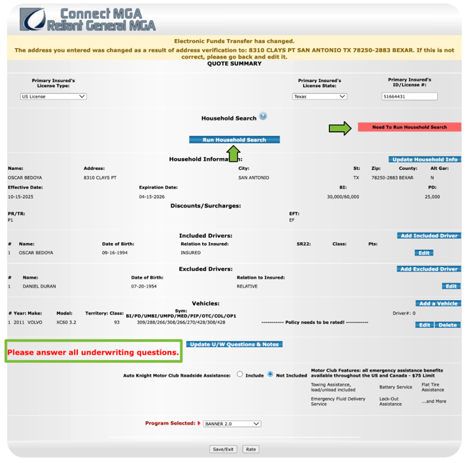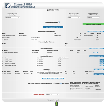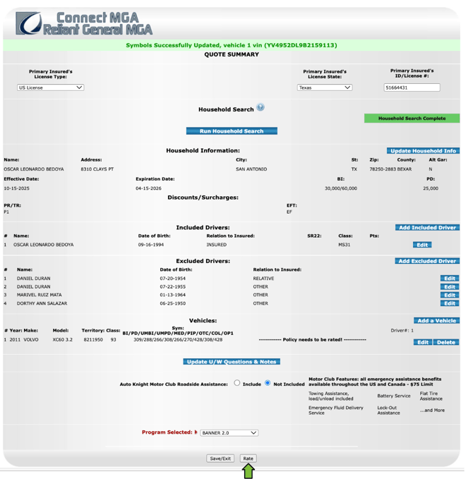 Una vez completadas las etapas previas — búsqueda de “Household” y respuestas de Underwriting (UW) — se habilita la opción para calcular la tarifa (Rate) de la cotización.