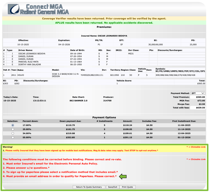 1. Se revisa el resumen de la cotización mostrada en pantalla (nombre del cliente, MGA seleccionado, y detalles básicos de la póliza).