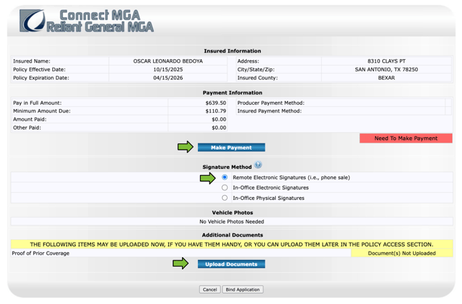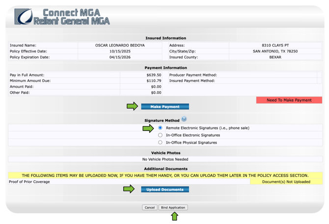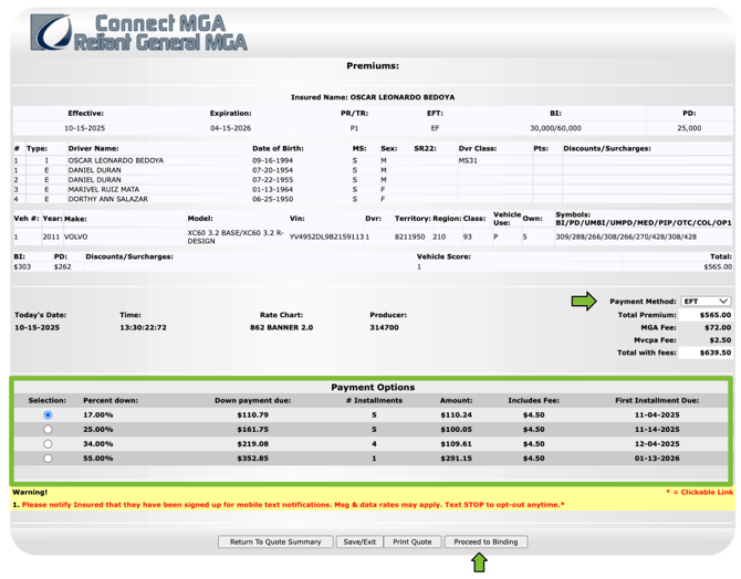 3. Una vez seleccionadas las preferencias, se hace clic en “Proceed to Binding” para continuar con la configuración final del pago y emisión de la póliza.